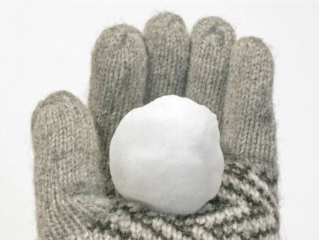 A child's gloved hand holds a snowball on a white snow background. Outdoor activities, outdoor games, winter entertainment.