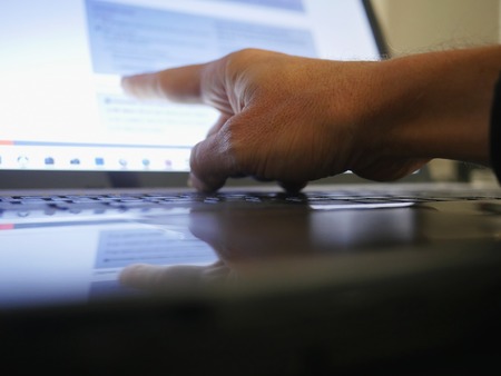 close-up of urnecognizable man using laptop while pointing at screen with index finger