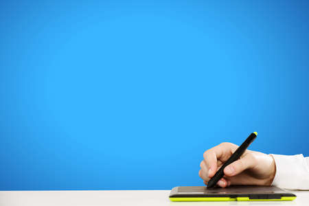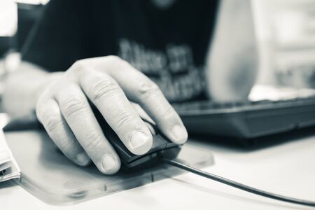 The man working from home. Close up at the hand and ergonomic computer mouse. Working during COVID-19 concept.