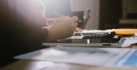 Coworking process, entrepreneur team working in creative office space. using digital tablet docking keybord and laptop with smartphone on marble desk,light beam effect
