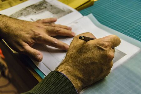 Cropped view of the hands of a male worker preparing the design of the leather in the work table to upholstering the interior car components in a leather upholstery factory