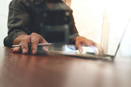 close up of businessman hand working with smart phone and laptop and digital tablet computer in modern office