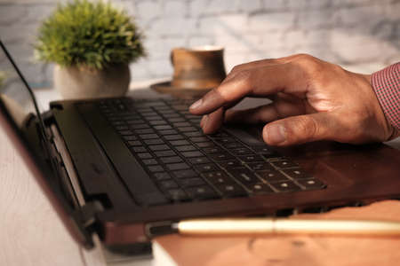 man use laptop computer in work photo with memory,batterynotebook,pen,on the table