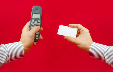 Important contact us information with a hand holding a phone and another holding a contact business card with empty space for text getting ready to call