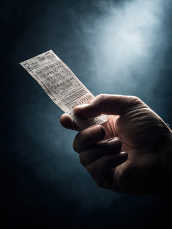Close-up of a hand tightly holding a lottery ticket amidst a moody background, capturing the excitement and tension of dreams and possibilities at play