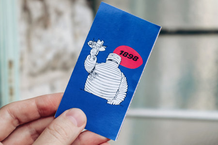 Nice, France - 27.01.2024: A man's hand holds vintage pictures of Bibendum, the mascot of the Michelin brand.