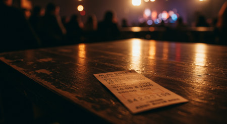 High angle, cinematic flat lay of worn concert and movie tickets symbolizing shared memories and nos