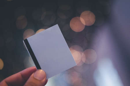 Male hand holding blank sheets of paper (tickets, flyers, invitations, coupons) on bokeh light background