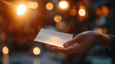 A person holding up a blank white card in front of city lights, AI