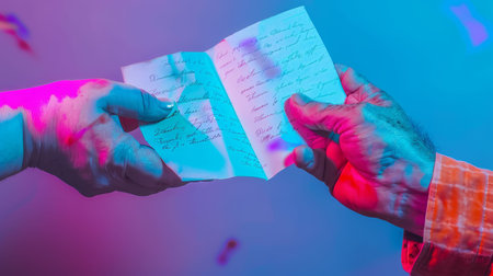 male hands holding a paper poster on a dark blue background