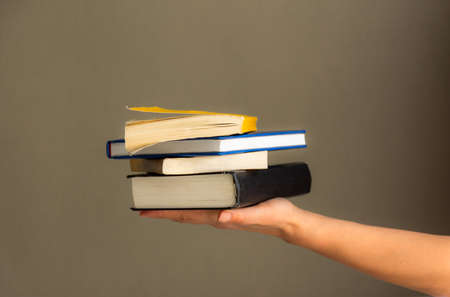 A stack of books in your hand, A day of Books, several books on one hand on a neutral background. Home leisure. Self-isolation of the house. It's good to be home. Home schooling.
