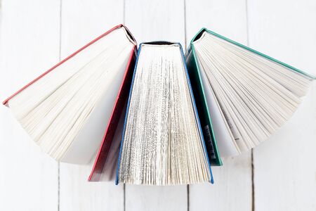 Three open books stand on a wooden table. Education concept