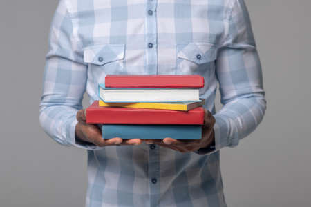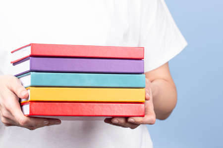 Female hands holding pile of books over light blue background. Education, self-learning, book swap, hobby, relax time