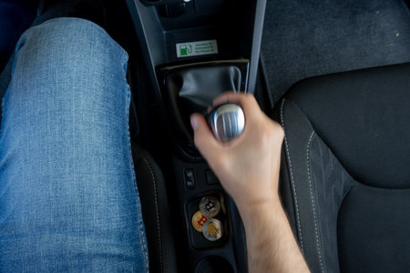 Male hand holding manual gearbox in car