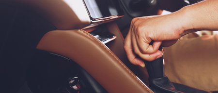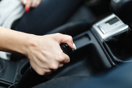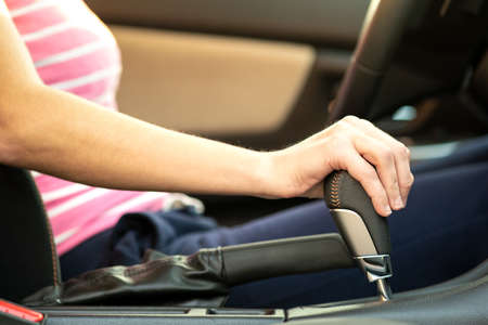 Close up of female driver hand holding hand brake in a car.
