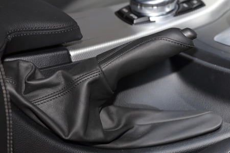 Interior modern car details - close up leather handbreak lever