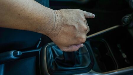 Male hand holding handbrake of car for parking.