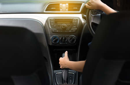 Close up of woman shifting gears on automatic gearbox and driving car. Female hand shifts the hydro sitting in a vehicle. Auto business, car sale, consumerism, transportation and travelling concept.