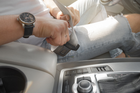 Man putting car seat belt before driving, close up at belt buckle, safe drive concept, selective focus