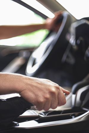 Side view of human hand holding levels of automatic car gearbox, driver seat