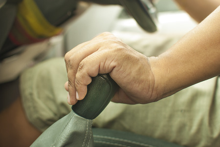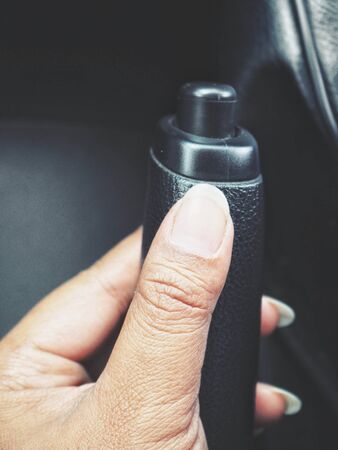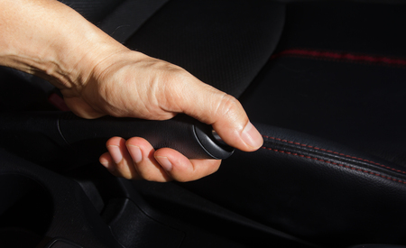 Close up hand holding the car handbrake