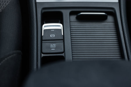 Detail of a parking brake in a modern car. Electronic parking brake button in a modern car. Button closeup.