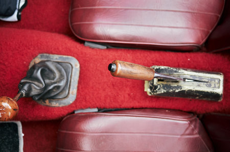 Car's gear shift is shown with a leather cover and a wooden knob. Concept of nostalgia and classic style