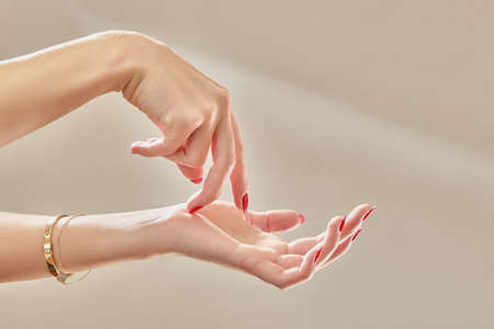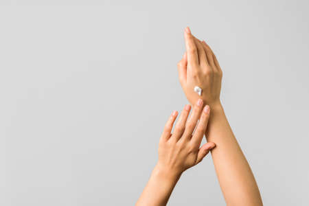 Close up horizontal photo of female index finger rubbing cosmetic cream onto other hand. High quality photo