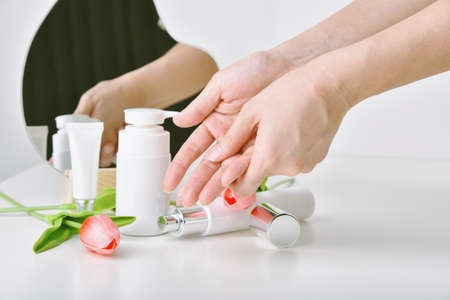 Woman holds cream bottle and applying moisturizer to beautiful hands for clean and soft skin. The concept of health and beauty.