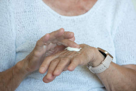 Senior women apply hand cream on her hands. Close up. Seniors everyday routine.