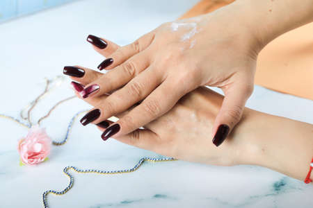 Hand skin care, cosmetology concept. Woman applying hand cream after bathing. Close-up on hands Skin care concept