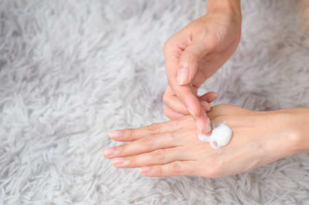 Woman applying moisturizing hand cream on hand with carpet background, Health care concept.