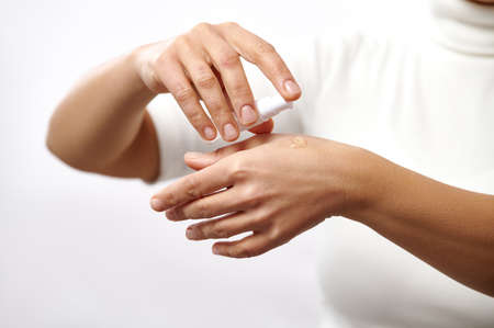 Applying moisturizing cream on hands. Skin care