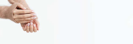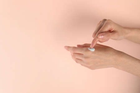 Female hands with natural pink manicure applying moisturizing cream or lotion on beige background. Bodycare, skin protection concept. Woman in white uses beauty product. Spa procedure closeup.