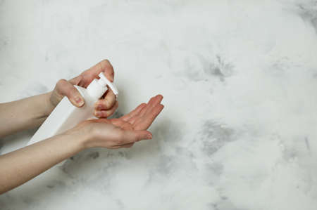 Women's hands rub disinfectant gel in hand. Top views