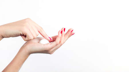 woman s hand with moisturizer isolated white background. High resolution photo