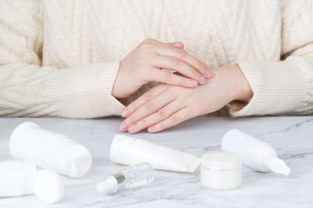Woman applying moisturizing cream on her hands with skincare products on marble table. Skin care routine concept.