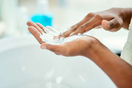 A top quality shaving foam is key. anonymous person rubbing shaving foam into their palm.