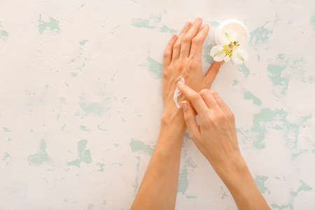 Woman is smearing her hands with cream. Concept of skin care and choice of natural organic cosmetics. Closeup.