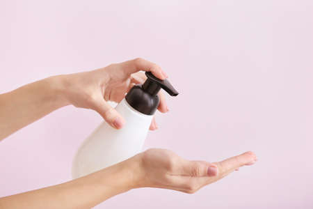 Woman hand applying lotion cream isolate on pink background.