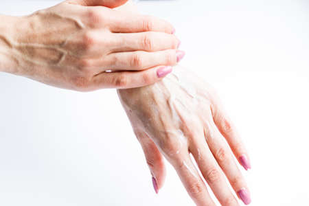 White cream on a woman's hand on a white background .Woman at home spa creaming hands close up photo. Selective focus.