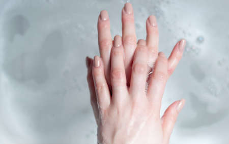woman washes her hands over water with foam