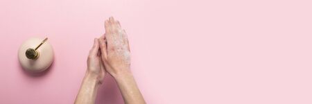 Hand washing. Soapy female hands and a bottle with a liquid soap dispenser on a pink background. Concept of the rules of washing and handling hands. Top view, flat lay. Baner.