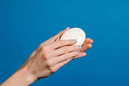 female hands with tender skin and blue manicure holding white lily flower with soft petals on grey background