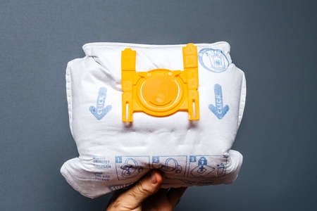 Paris, France - May 16, 2019: Man hand holding against gray background used Swirl Vacuum Cleaner Bags model S67 for Siemens and Bosh - German quality product
