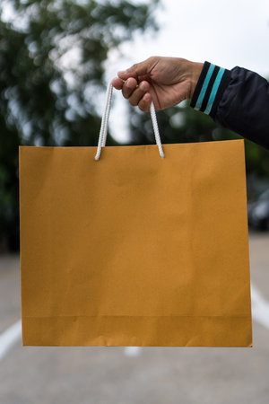 Brown paper shopping bag on hand. Close up