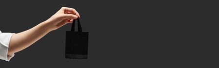 cropped view of woman holding small black shopping bag in hand isolated on black, panoramic shot