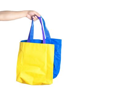 Hand holding shopping bags isolate on white background.