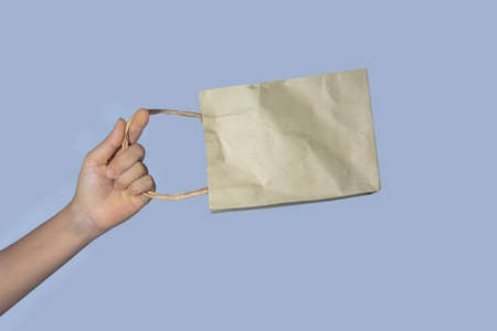Wild banner whith a child's hand holding a kraft bag on a blue background. The concept of shopping, zero waste, ecological packaging.
