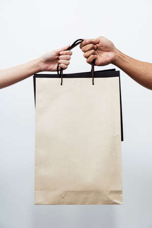 Close up shot of female and male hands holding black paper bags after doing shopping together isolated over light background
